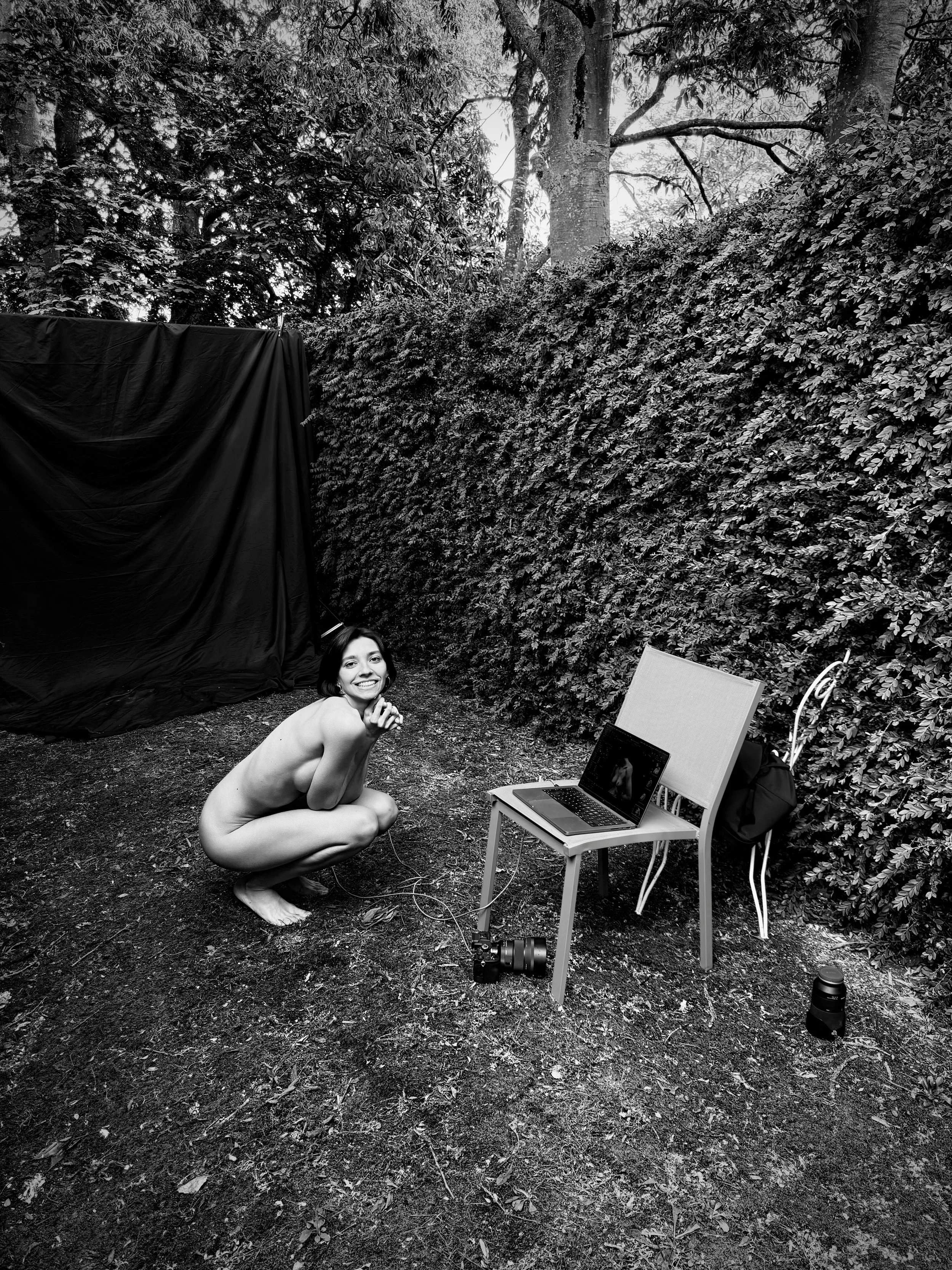 We moved between composed portraits and bursts of mad energy as she ran across the lawn chasing my camera. The grand finale was entirely her idea, perched on a stone lion at the entrance, waving her bra overhead like a regal trophy. None of it planned, all of it collaborative. Later, back home, she helped me choose the edits, and unsurprisingly there were many keepers.