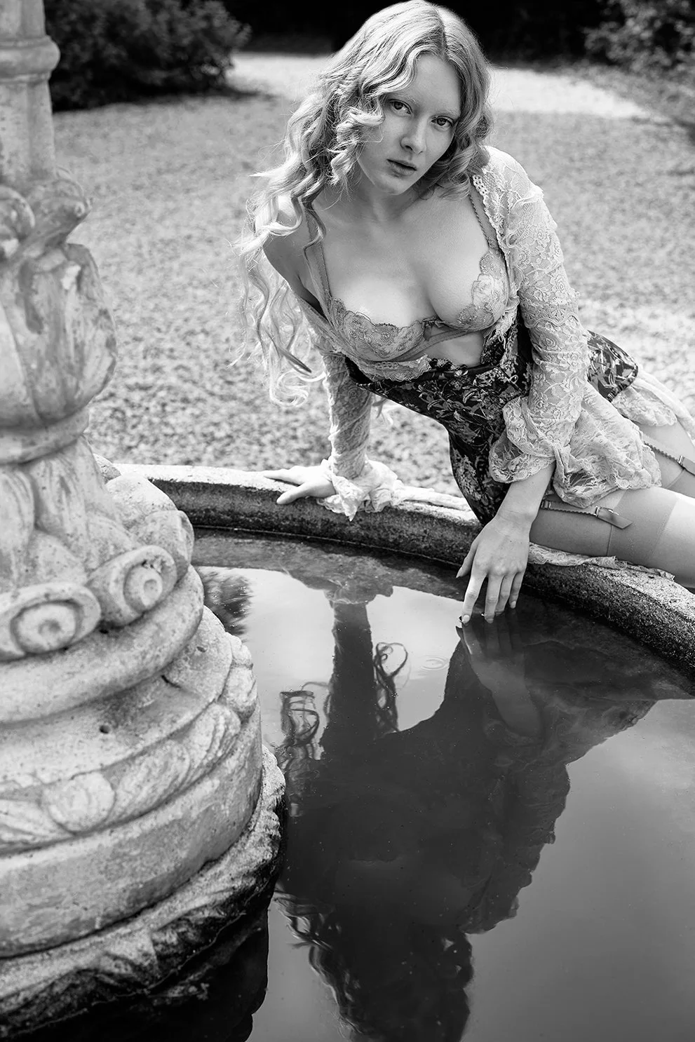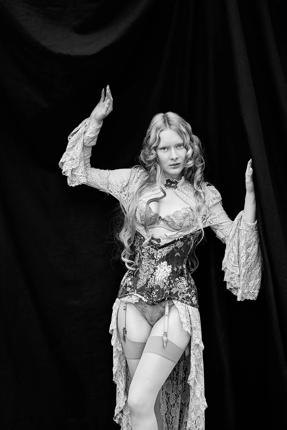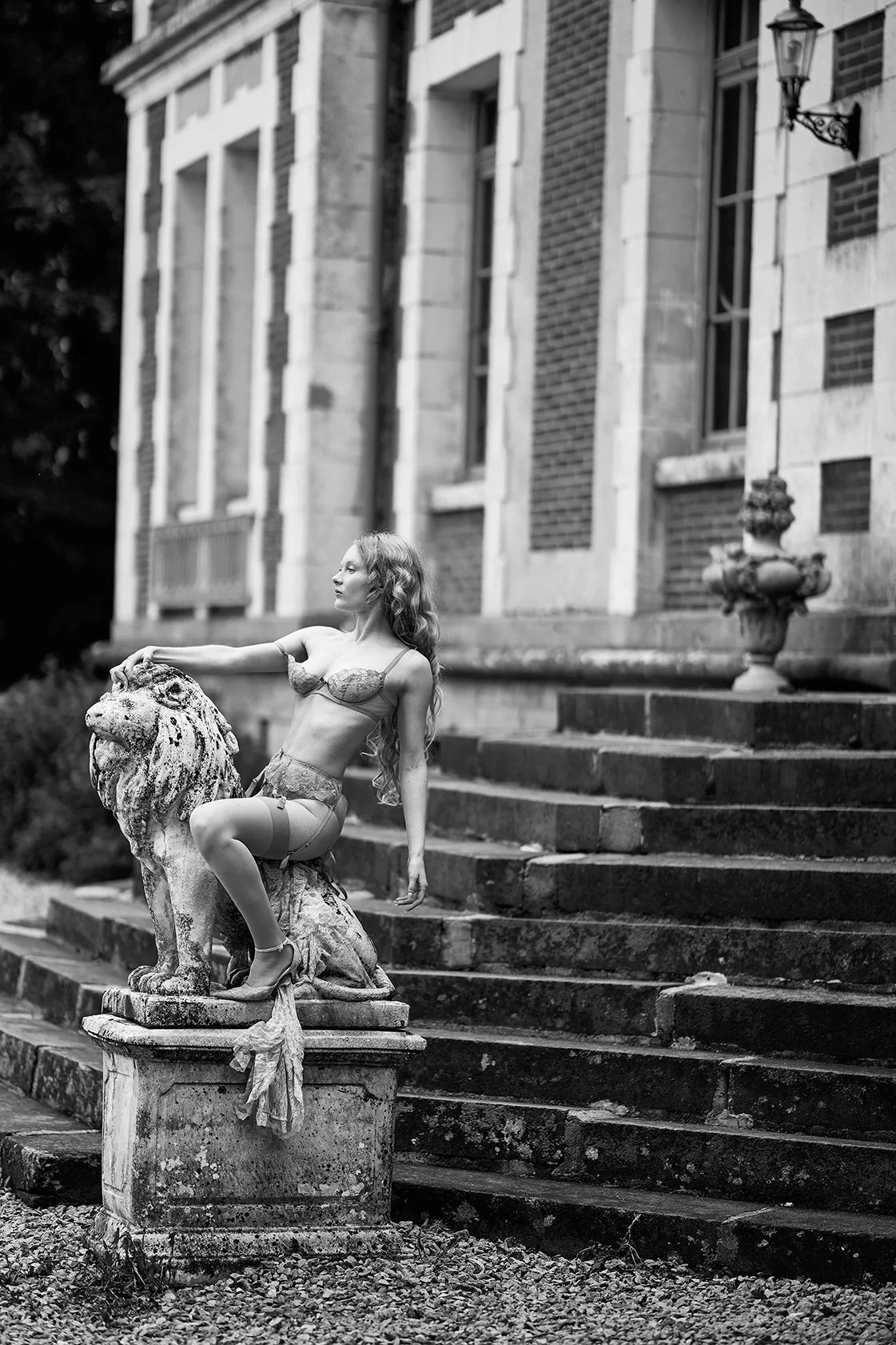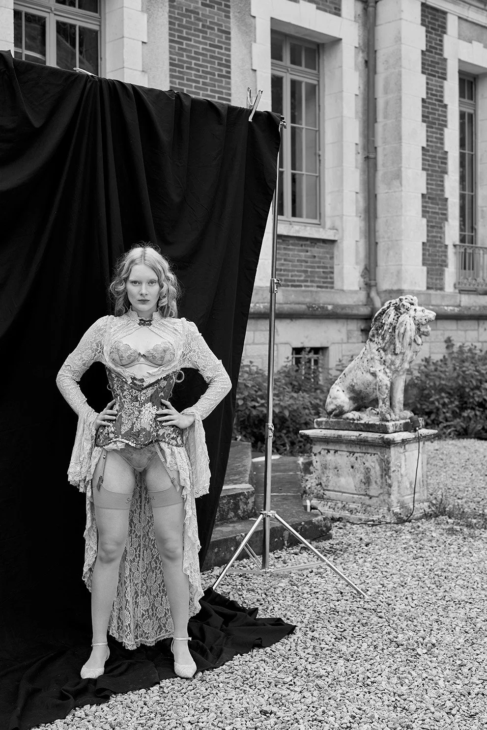 I came to France knowing I was going to visit this chateau and wanting to juxtapose it with this back backdrop. A good insight into how my mind works! This was our first shoot together and if Anna was worried about my wild concept she didn’t show it. I explained I wanted a vintage feel to the outfit, something to match the scenery and her period look. She immediately announced: ‘Versailles!’ followed by the model equivalent of “hold my beer” and returned wearing this magnificent corset and matching accoutrement. Anna put on a playlist of classic music and was soon in character. It was as if this was a part in a play that she had always wanted to play but until now hadn’t had the right chateau.