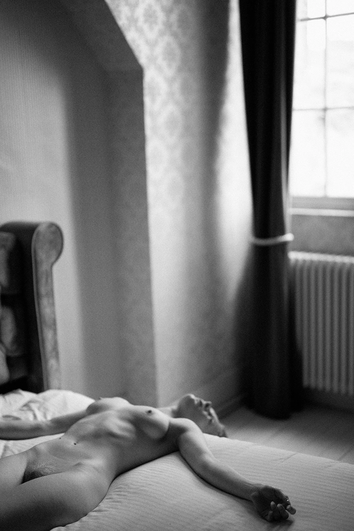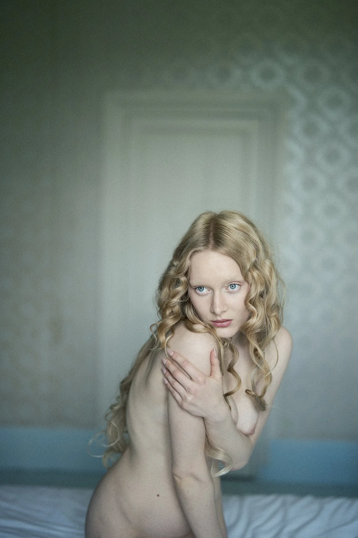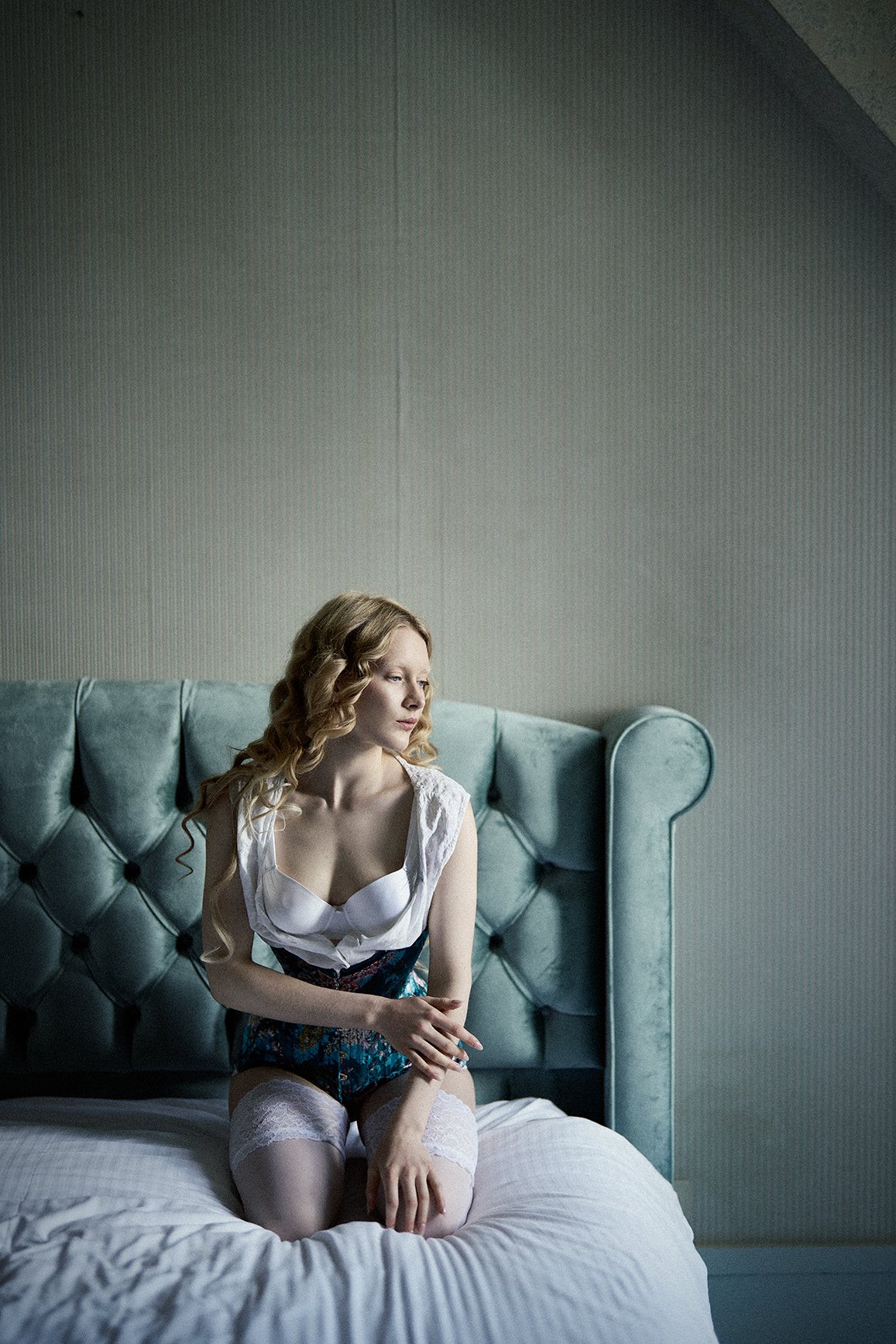 These blue shots were my last with Anna and my penultimate shoot in France. It was a mixed day of weather but the sun was trying to make an appearance through the clouds. I opted for an attic room at the top of the chateau, it had nice light and importantly nice blue tones to the furnishings and wall paper. The week before I had been in a gallery and bought a postcard. A simple portrait of a woman sat on a bed, lost in thought and her bare skin pale against the simple tones of the room. I gave this postcard to Anna, not as a means to copy the image, but so she could see what inspired me and the mood I was going for.